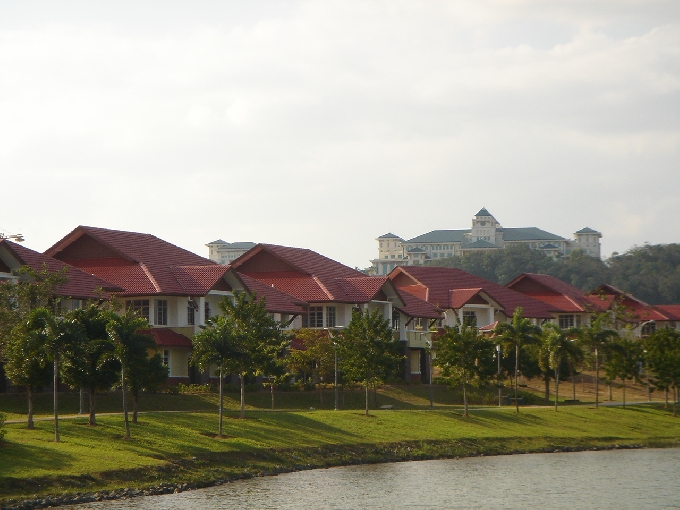 호수의 배위에서 바라본 Putrajaya의 고급 주택